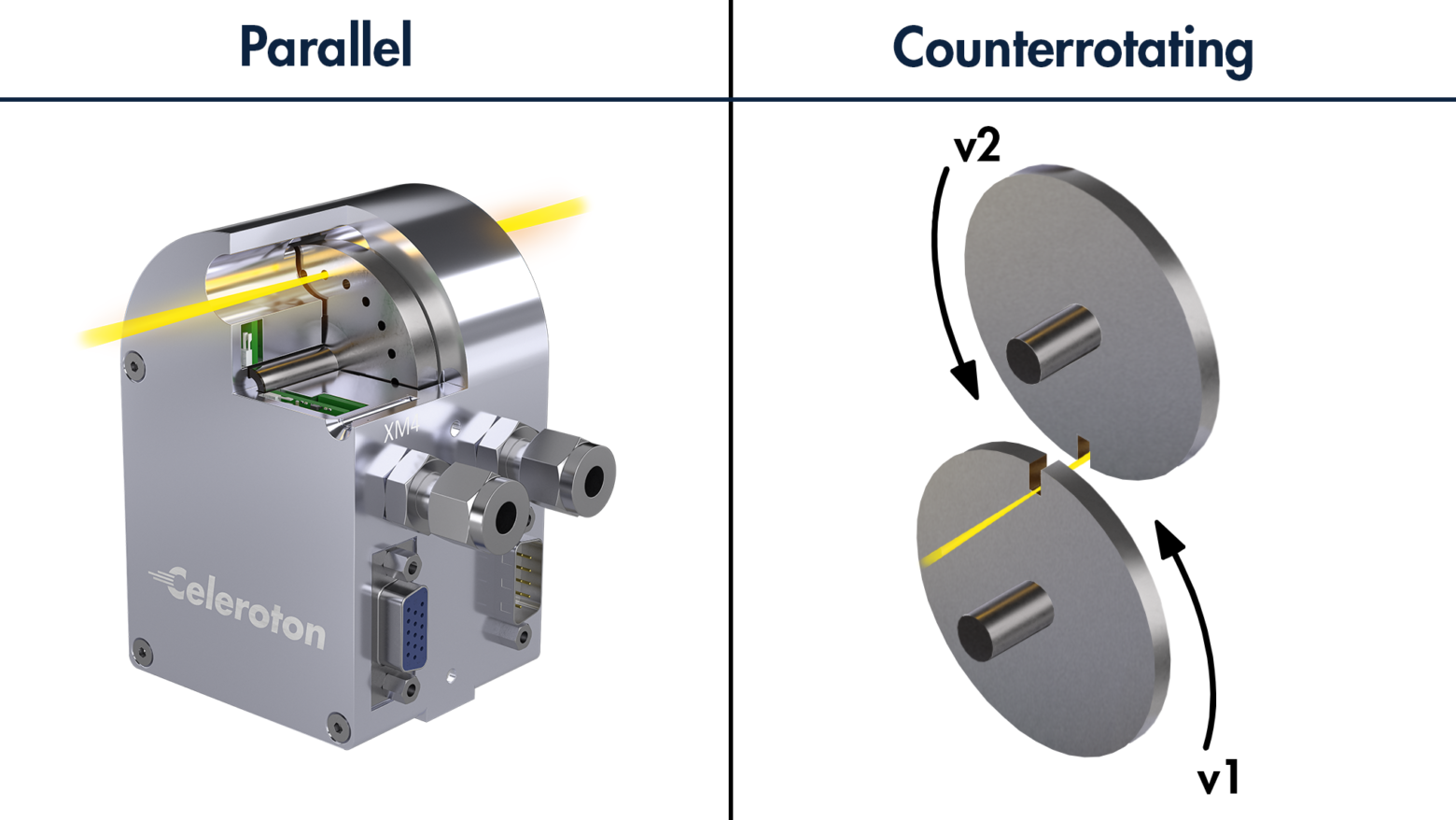 In order to meet the requirements and still be able to use our trusted small-scale chopper technology, we came up with the counterrotating topology design approach where two choppers with parallel topology are arranged in series with opposite direction of rotation (see Figure 1 “Counterrotating”).