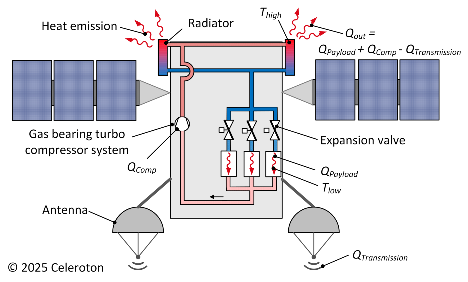 This is exactly where a heat pump makes a difference. By lifting waste heat to a higher temperature level, it allows smaller radiators to reject the same amount of excess heat – enabling the usage of precious volume and surface of satellites for payload such as communication electronics and antennas.